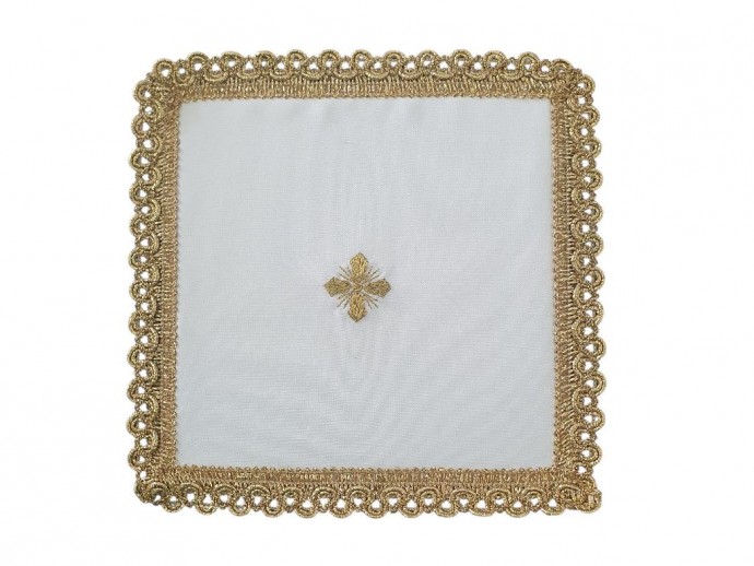 Palla copricalice rigida colore avorio con ricamo croce dorata, confezionata in tessuto vaticano di poliestere.